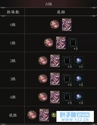 卡包兑换券 [决战回合(A组)]0胜:头像、卡背 1胜:头像、卡背、随机卡包券3张 2胜:头像、卡背、随机卡包券3张、次元石碎片1个 3胜:头像、卡背、随机卡包券3张、次元石碎片2个 4胜:头像、卡背、随机卡包券3张、次元石碎片3个 5胜:头像、卡背、随机卡包券3张、次元石、称号