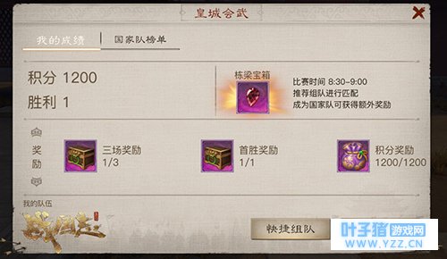(图2 《战国志》皇城会武玩法) 《战国志》皇城会武玩法将在每周三和周日晚上8:30-9:00开启,各位将军可以选择组队前往,或个人前往参与比赛。在会武开始后,将军们各有3分钟准备时间,此时匹配区会刷新多个宝箱。而在会武正式开启后,各位将军即可组队或自行匹配对手,若战斗胜利则加分,若失败则减分,最终参与比赛达到三场、首次取胜、达到一定积分均可获得大量奖励!