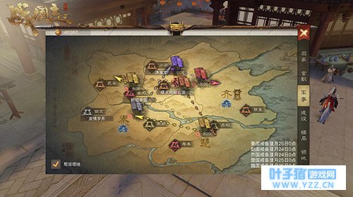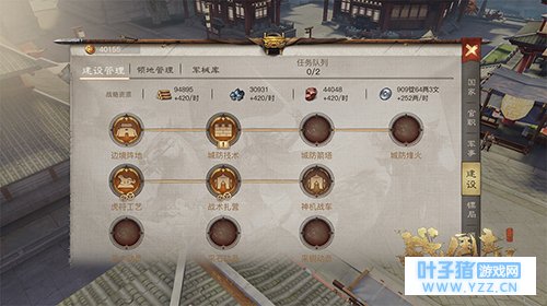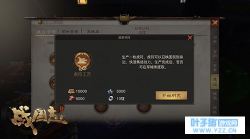 (图5 《战国志》国家建设) 在前线修筑边境阵地后,国民可直接安全复活到边境,大幅提升支援前线战斗的速度。虎符则可以由国王、太尉、丞相和御史大夫在本国领地使用,召集国民到身边,从而快速集结战力。