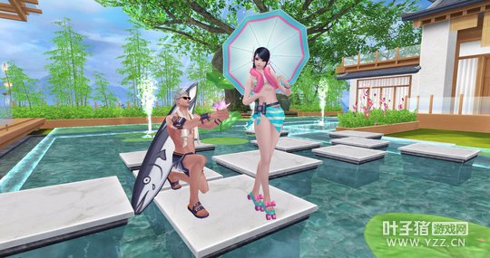 镜头再转,开放式庭院里竹影摇曳随风而舞,充满江南园林风情的院落中,一处现代化的游泳池掩映其间。清澈的池水、大大的遮阳伞、舒服的沙滩椅,让穿着泳装的八部众们尽情嬉闹,清凉无边!