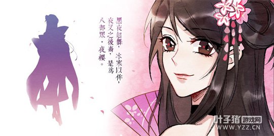 八面玲珑、消息灵通的夜樱,是八部众在中州最强大的耳目、最有效的情报来源。上阵对敌之时,团扇纸伞、灵鹤幻蝶将化为她的利器。在炫目迷离、美不胜收的舞姿下迎战一切邪恶,团扇剪碎阳光斑驳、纸伞掩着眼波零落,唤灵鹤七进七出敌将授首、拈幻蝶翩翩跹跹邪魔辟易——无弓无箭的另类女“弓手”,用她独特的战斗方式为天命者们带来全新的战斗体验与绝佳的视觉享受!