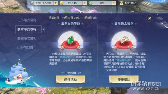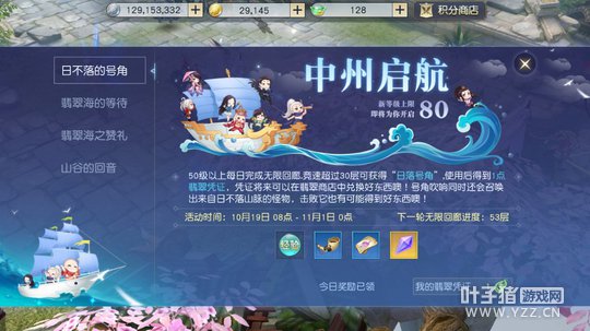 从今天开始直到11月1日0点,日不落的号角活动都将持续开启!天命者们只需要参与到“无限回廊”的竞速玩法之中,突破一定层数就能领取“日落号角”、经验及明光玉等各类珍稀道具! 吹响日落号角后,天命者们可以击杀召唤出来的日不落山脉的怪物、获得额外奖励;同时收获“翡翠凭证”,在翡翠商店中兑换各种珍稀道具、助力天命者中州启航! 中州启航:翡翠海的等待