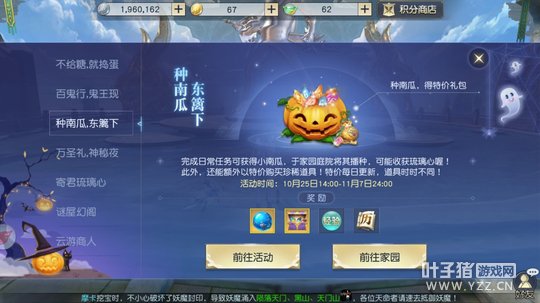 从今天开始直到11月7日24点,天命者们只要通过藏宝图挖图、参与到每天的“百鬼猎行”活动之中,均有机会额外获得坐骑精华袋的奖励! 晚上20点至23点,触发“百鬼猎行”的天命者还有可能遇到鬼王!成功击败鬼王后,就能获得朱颜染等染色道具、琉璃心、坐骑精华袋及南瓜种子等丰厚奖励!然而鬼王实力超群,天命者们可不要落了单,记得与好友们组队挑战! 种南瓜,东蓠下:家园庭院添新绿,珍稀道具日日新