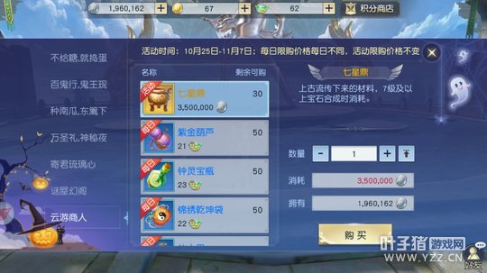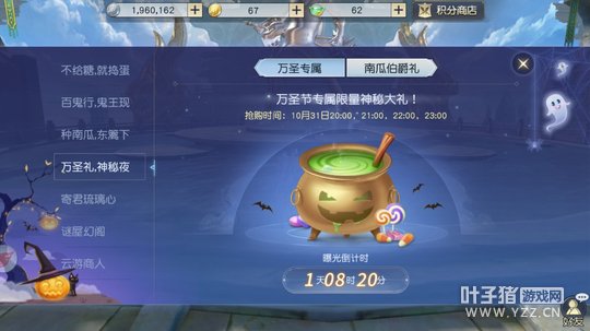 从现在开始到11月7日晚24点,《镇魔曲》还为天命者们备下了鬼火管家、蝙蝠夫人、南瓜伯爵三份万圣节大礼包!琉璃心、璀钻、各类葫芦等珍稀道具大量相赠,最高等级的南瓜伯爵礼包中还拥有限时出售的稀有坐骑“南瓜伯爵”——两个南瓜灯笼吊运的秋千长椅!不同的礼包售价不同,天命者们可视情况购买、将福利收入囊中! 在10月31日晚上,还会有万圣节专属限量神秘大礼揭晓!20点、21点、22点和23点四个时间段分批次开抢,想知道神秘大礼是什么吗?记得锁定10月31日万圣之夜! 云游商人:每日上新,好货银币购