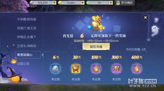 运气不错的天命者,还能收获到琉璃心作为回报,更有每日刷新的特价珍稀道具购买特权放送,让天命者们能根据需要买下钟意的道具,助力天命者们更快更轻松地成长!只要拥有“琉璃心”的天命者都可以到谜屋幻阁中进行“摇一摇”:各类挂饰、织造材料、合成材料应有尽有,能有什么收获只看天命者们的运气! 万圣礼,神秘夜:神秘大礼限量售,专属坐骑人人爱