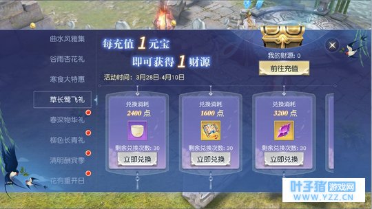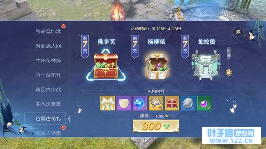 “谷雨杏花礼”送上超值礼包,除了各种珍稀道具外,礼包还将放送全新的时装和坐骑!购买礼包的天命者还能获得流觞杯, “曲水风雅集”活动中利用流觞杯参与抽奖,魂印、探魂钉、魂珠、魂印残片、石火精、魂印宝鉴等多种奖励送上!“寒食大特惠”中,天命者们还能享受购买魂印宝鉴获赠艺人宝匣的超值福利,多买多送哦!