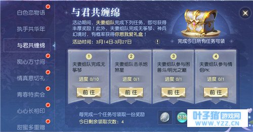 夫妻齐上阵,好礼拿不停 战力不足、配合不默契?那就一起参与“与君共缠绵”活动吧!在这里天命者们不需要进行额外任务,只要结为夫妻的天命者组队完成日常任务,就能收获包括各类珍稀道具在内的额外奖励、培养夫妻双方的默契,让天命者们在“情侣PK”中拿下更好名次! 错过活动不用愁,新番开启奖励不误