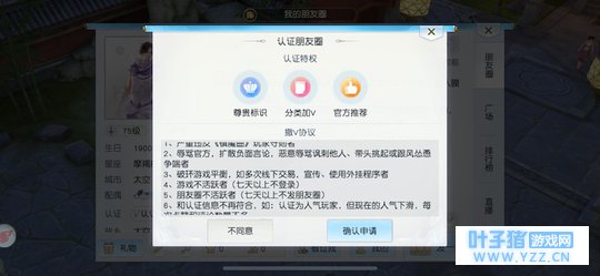 当天命者们认证成功后,申请的加V标识及认证称号就会出现在天命者们的朋友圈里。为了吸引更多粉丝关注,成为名副其实的大V网红,天命者们要经常发布内容与粉丝们互动,多多发表自己的最新动态哦! 值得一提的是,为了保持互动的良好氛围,《镇魔曲》会定期收回不活跃的加V认证。比如才华型大V,超过一定时间没有发布对应的才华(跳舞、画画、唱歌等)到朋友圈里,有可能会被回收认证。当网红也离不开经营和管理,天命者们可要多多上心了!