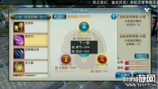 ④选择自己需要的属性,使用道具日月精华进行升级。这里有个边际效益就是升级到一定程度,道法加成较少了不划算,建议分散投资。(~说的跟理财一样~晕) ⑤所带的法宝阳属性和阴属性加起来的等级可以激活额外的属性加成。