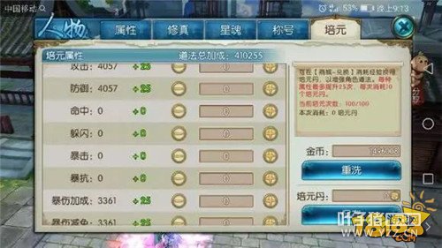 5,法宝 目前合欢几乎都是天琊,(花非花那就更好了),血练属性呢,攻击 防御 爆伤,这个血练属性还比较好收一点,还有 攻击 爆伤 爆减 这个更好,不过非常不好收,楼主的罐魔自作孽,整垃圾了,没那么多金币锁着洗,令牌也没了,所以先弄个绝恋好了。