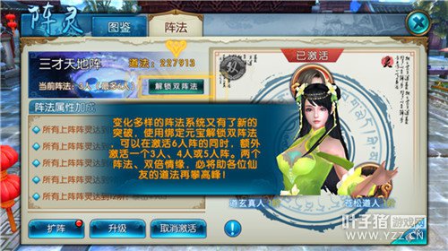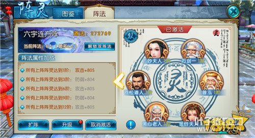 2、解锁双阵法,是指3人阵、4人阵、5人阵、6人阵中,可同时最多激活两个阵法。激活当前阵法,要点击左下角激活,才可生效。如果要更好阵法,需要先取消原先激活的阵法。两个阵法上阵灵的基础情缘、炼灵情缘、阵法属性同时生效。