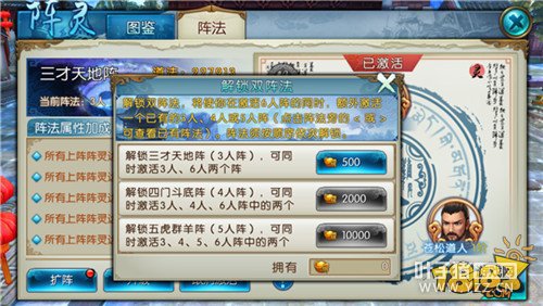 3、6人阵默认解锁双阵法功能,3人阵、4人阵、5人阵可额外使用绑定元宝依次解锁。
