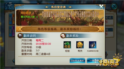 参加资格 同一帮派三人以上组队,且队内成员等级大于等于35级。 活动时间 每周二20:00-20:30,最多可以参加7次。