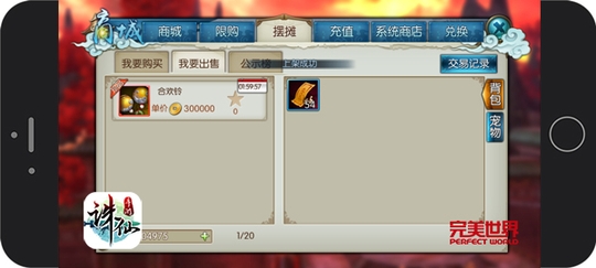图3:《诛仙手游》交易商城 生财有道 卖出日进斗金 大量闲置装备首饰等物品不但占用背包,还没什么用,所谓“食之无味,弃之可惜”,但是在《诛仙手游》这些闲置的东西可是你的生财良方。 打开【我要出售】分页,选择预售物品,进入定价界面。物品分为“珍品”和“非珍品”两种。非珍品货物出售,只可以在系统给出基础价上下50%区间内为物品定价,但珍品就不一样啦,可以自由输入价值定价。