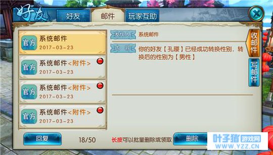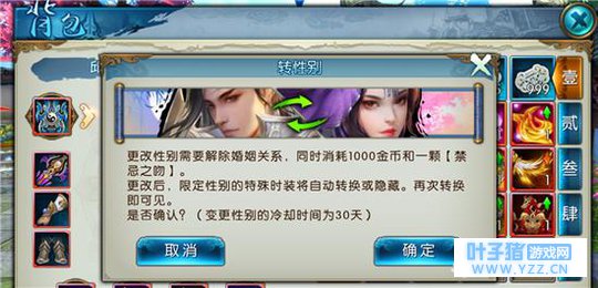 1)转性别条件: ①无配偶。 ②不在飞天状态。 ③不在骑乘状态。 ④不在交互状态。 ⑤不在组队跟随状态。 ⑥距离上次转性别≥30天。 ⑦使用道具“禁忌之吻”并消耗1000金币。 2)转性别成功后,好友将收到系统邮件提醒。