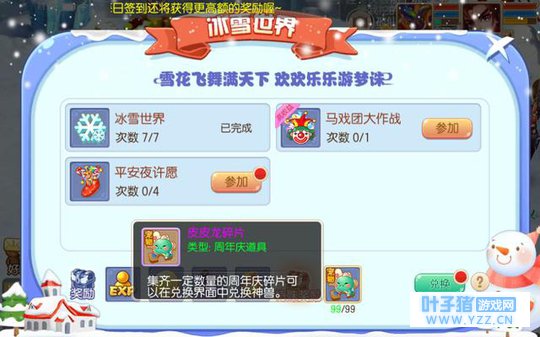 冰雪世界活动分为冰雪世界和马戏团大作战,每天个可以完成一次,通过这两个活动每天就可以积攒到大概6个碎片,然后加上其他方式获得的和之前周年庆活动剩下的,凑够99个就可以去兑换啦~