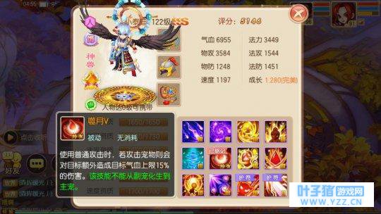 神兽大天狗 大天狗和其他神兽一样也有属于自己的持有技能——噬月,这个技能非常针对敌方宠物,普攻时,目标为宠物则目标额外造成气血上限10%的伤害。所以从某种程度上说,大天狗适合往隐攻宠的方向培养,毕竟是攻击性技能。另外四个技能分别是连击、飞行、重生、幸运,本身技能都非常实用,但对于现在稀有度而言,不打全技能简直是暴敛天物呀!