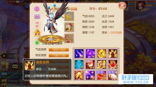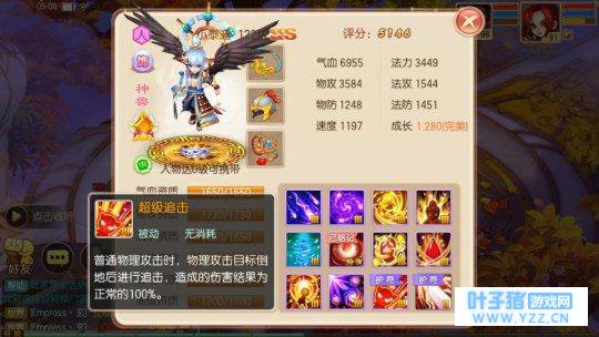 神兽大天狗 仔细一看,大天狗达到5阶后,成长从1.180上升到1.280,其他资质也暴涨,看着真惊人,不得不感叹大天狗作为SSS级神兽的存在,第一绝对实至名归。大天狗的物攻资质和速度资质都非常高,速度仅仅比物攻少30点,再配合超级飞行技能,恐怕这速度比一般玩家的门派人物还要快,嗯......是的,大天狗比小编的人物快多了,好心塞,哇呜一声哭了出来。