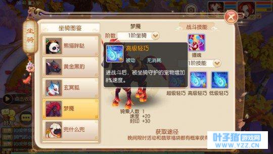 梦魇作为圣巫门派的专属坐骑,增加人物速度和封印能力,战斗技能为摄魂:对敌方使用门派封印技能前,有概率增加主目标被封印命中概率,同时被守护的宠物增加百分比的速度,获取途径有两种:晚间限时活动和翡翠福袋概率获得。