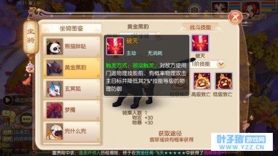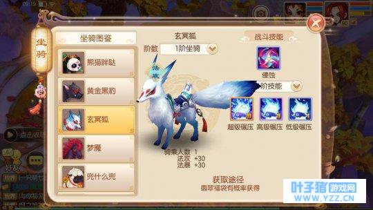 法术输出系专属坐骑,跟黄金黑豹差不多,战斗技能为侵蚀:对敌方使用门派法术技能前,有概率使其降低法术防御,守护技能为碾压:被守护的宠物增加百分比的法术伤害,获取途径从翡翠福袋有概率获得。