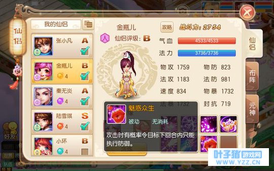 说到青云派的输出大佬,陆雪琪可以说是当之无愧。而陆雪琪真正输出高的原因就在于这个技能,能够大概率出发二次施法,这就让她的攻击能力直接增长了50%左右,配合上5目标的群伤,效果可以说是相当不错。 金瓶儿——魅惑众生