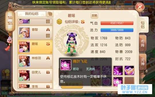 金瓶儿的伤害高是大家都知道的,不仅仅是因为她可以增加对异性的伤害和忽略防御值。更重要的是她的攻击有几率让对方下回合只能防御。配合上移花接木,如果一回合直接废掉了对面三、四个人,那这场战斗基本就盖棺定论了。 碧瑶——摘叶飞花