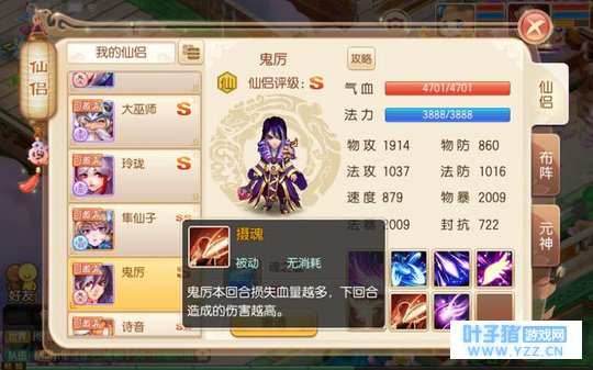 作为主人公张小凡的邪恶化身,鬼厉必然也有着他的一技之长,那就是技能摄魂了。本回合你把他打得越惨,只要他没死,那么下回合他就一定能够还回来。试想一下如果集火鬼厉结果给他留了一丝血,想哭的心都有了吧! 游戏中每个仙侣都有自己的招牌技能,你心中的最强仙侣技能是什么呢? [编辑:叶子猪小秘书]