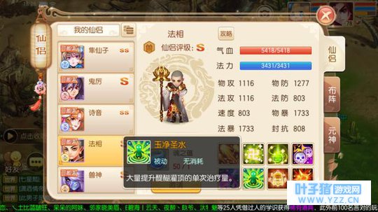仙侣的属性都差不多,而且天音派并不是输出仙侣,所以决定能力的就是技能了。法相的第一个专属技能可以大量提升醍醐灌顶的治疗量,我们都知道醍醐灌顶是天音最主要的加血技能,可以一次为3名队友恢复血量,有着非常重要的作用。这个技能的增强可以说是奶妈能力最直接的增强了,非常的有用。
