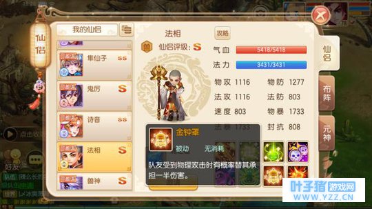 第二个技能也就是我们说的“挡刀”技能,队友受到物理伤害时有几率为其承担一半,虽说都是受伤害,但是这是有本质区别的。从图中可以看出法相的物防有1277,而金瓶儿、陆雪琪的物防却只有可怜的700多!同样是一次攻击,但是落到法相身上就减少了一半的伤害,是非常好的减伤技能,可以防止己方的输出被秒。