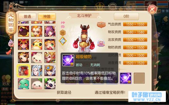 综合来看,北斗神驴虽然没有群体攻击效果,但是它单体攻击的效率实在是惊人的高,所有自带技能除了高级就是超级也说明了它的品质即使在神兽中也是一等一的,实际战斗中的攻击力更是几乎无人能敌。需要注意的是,由于超级破防的存在,应该尽可能早的让神驴出手打出减防效果,而宠物无法享受阵法带来的速度加成,所以在为它选择装备的时候应该以速度加成优先。 这样一只厉害的宠物自然不是那么容易获得的,目前只有开启福缘宝箱有机会获得北斗神驴,喜欢的小伙伴不妨来试试运气吧~ |