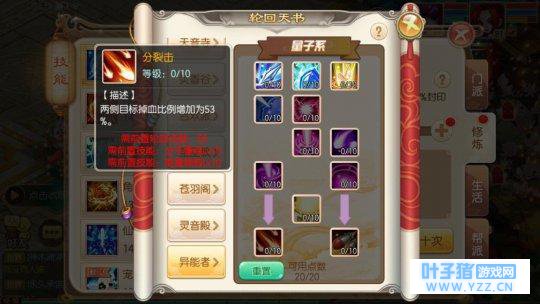轮回天书 兼顾流:克己10,凌波10,引力塌陷10,克隆体1,光子束缚10,能量倾斜10,加农粒子炮9,优点是可以辅助,也兼顾了伤害。缺点是分裂击无法得到提升,这个方案其实小编是不怎么看好的,为什么呢?因为两边都兼顾,但是两边都平平,自然显得不太实用,不知道各位大佬有没有更好的加点方案?