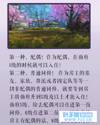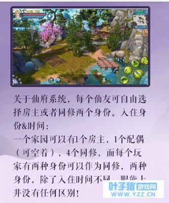 和好友经营家园的正确打开方式:仙府系统的开放,让玩家在游戏中更有归属感,有什么是比让好友一起经营家园更有意思的呢?每位仙友可自由选择房主或同修两个身份,一个家园有1房主、1配偶、4同修,同修跟房主的好感度最低要达到500才能被邀请入住哦~如果房主授权,配偶和同修都可以种植、装饰、祈愿,一起打理家园,是不是美滋滋?