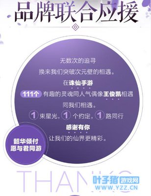 说起现在的各家品牌,撕资源撕流量撕粉丝简直不要太严重,随时都是脸上笑嘻嘻,心里…Emmmm,好比现实版的甄嬛传。但你见过111家品牌联合应援吗?应援的还是一款全新手游,这是个什么情况? 3月23日,暨@诛仙手游官博公布由王俊凯扮演新《诛仙手游》中全新职业——灵契师墨白,并公测两日后,又发布一条微博,感谢111家品牌联合应援新《诛仙手游》,为#次元少年王俊凯#应援打call,文案可是配的相当浪漫: 一束星光、一个约定,愿未来与君相伴,继续一路同行,并@了代言人王俊凯小哥哥,这波宠代言人的操作小编是服气的!