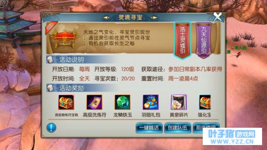 灵境寻宝分浩土灵虚引和九天仙缘引两种钥匙,前者通过日常副本获得,后者通过商城限购获取,周上限分别为20次和99次。队长还有额外奖励哦,心机宝宝们请自告奋勇创建队伍吧。