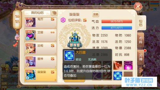 异能者仙侣 跟其他仙侣差不多,异能者仙侣柒柒柒的前四个技能都是门派技能,分别是原子核裂变、加农粒子炮、响尾蛇导弹、光子束缚,都是主要输出技能,但后面三个趣味性的技能了解一下。 双暗刻:造成伤害时,若伤害值最后一位为1.4.7时,则提示自身攻击力两回合,而且状态可以叠加。 大三元:造成伤害时,若伤害值最后一位为2.5.8时,则吸收本次伤害的一部分转换为自身气血。 大四喜:造成伤害时,若伤害值最后一位为3.6.9时,则提示自身防御力两回合,而且状态可以叠加。
