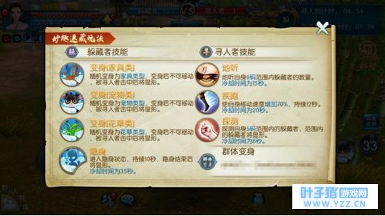 妙趣迷藏中既可以单人匹配也能多人一起玩儿。玩家可以选择躲藏者和寻找者的角色,而且拥有的技能不同。躲藏者将会随机变成场景中的一个物件,或许是一棵树,或许是一朵花。变身期间不能动,只能等待寻找者来发现。