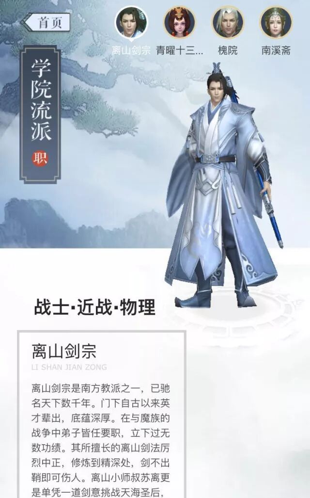 游戏学院流派分为离山剑宗、青曜十三司、槐院和南溪斋四大职业,特点各异,玩法不同,也从根本上决定了伙伴选择的不同。