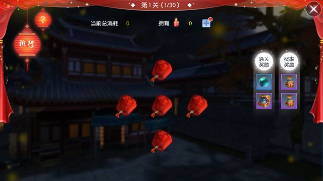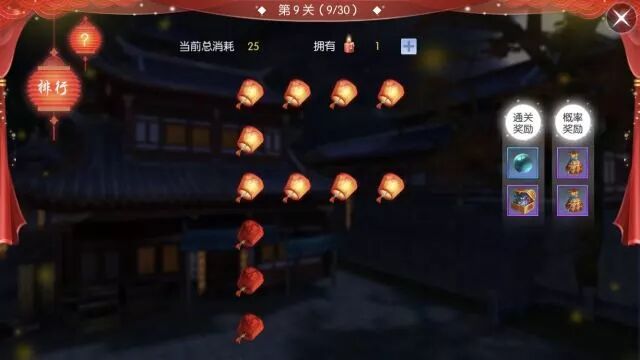 当灯笼全部点亮,则会自动跳转至下一关。但需要注意的是, 通关越多且喜烛消耗越少 ,则排名越高,如果两者均相同,则谁先到达谁的排名在前哦!