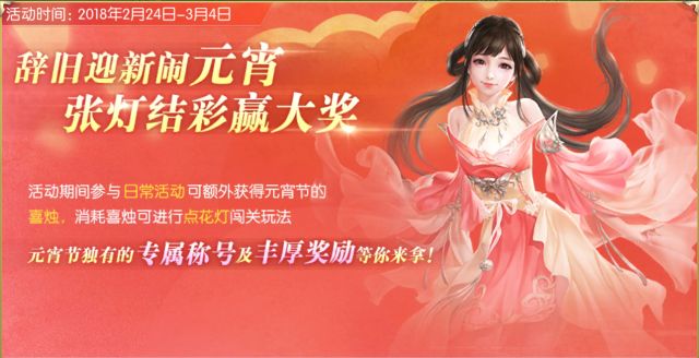 辞旧迎新闹元宵 张灯结彩赢大奖 “点花灯闯关”是为迎接即将到来的元宵节而准备的新玩法, 于2月24日-3月4日内 ,道友任意完成 日常活动 ,即有机会获得元宵节专属掉落道具“ 喜烛 ”! 消耗喜烛点亮花灯通关的关卡数越多,获得的奖励也越好。最终还可参与通关数排名竞争,获取 元宵节专属称号 和丰厚的 灯笼礼包 ! 那么这个新玩法到底是怎么玩的呢?下面就由落落来给大家说明介绍吧!