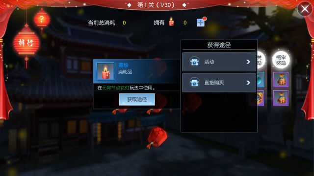 玩法介绍 游戏一共有30个关卡,每个关卡内都有多个灯笼等待点亮,当 灯笼全部被点亮 就算过关,并获得相应的道具奖励。 点亮灯笼需要消耗元宵节专属掉落道具的“ 喜烛 ”,“喜烛”可以通过 完成日常活动 掉落或者 消耗灵玉购买 来获取。