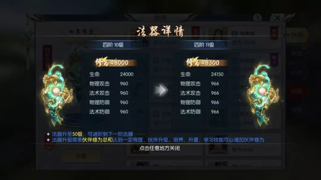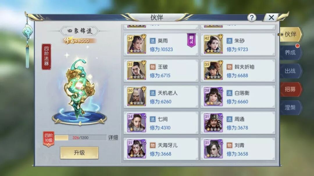 伙伴升级 法器进阶 升级出战伙伴 和 进阶法器 可以增加角色修为,这是众所周知的提升方法。不过大多数人,只会一股脑升级主战伙伴,从而忽略了非主力伙伴的培养。