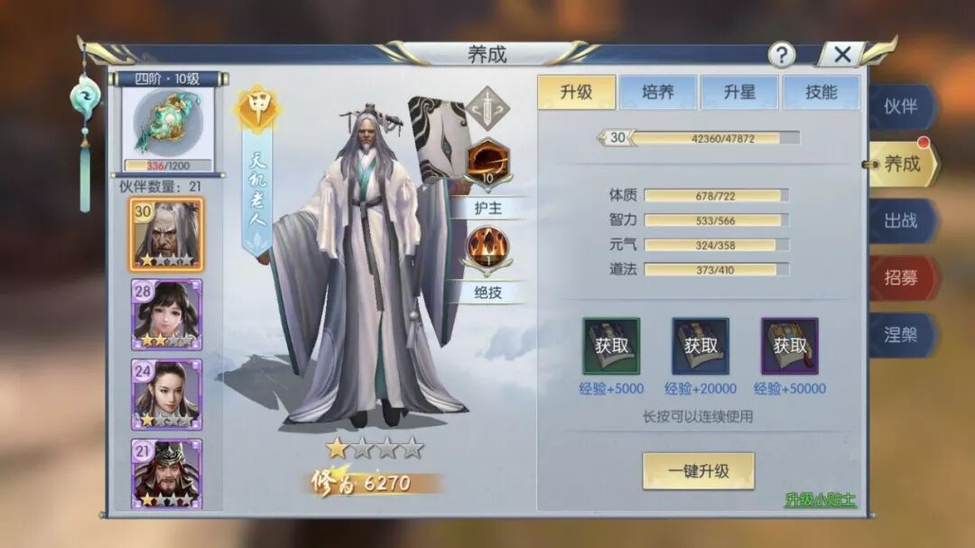 伙伴在低等级时,升级所需要的经验很少。以甲级伙伴天机老人为例,只需要 8本高级经验书 ,就能从1级提升至30级,伙伴修为从3530提升至6270,从而 可以 让法器升级两次,角色获得 600修为 的提升。