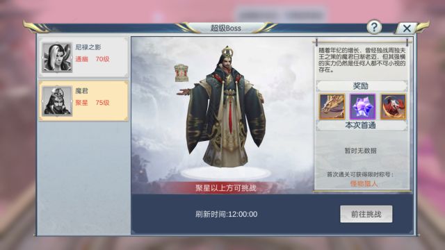 超级首领:魔君 上一代魔君,比起尼禄之影,老谋深算的魔君更加棘手!BOSS会分为 守卫阶段和魔君阶段 ,要分别 处理三个守卫之后魔君才会现身 ,魔君出现后也会 根据自身血量变化战斗方式,战斗时间较长 。 守卫阶段