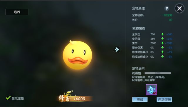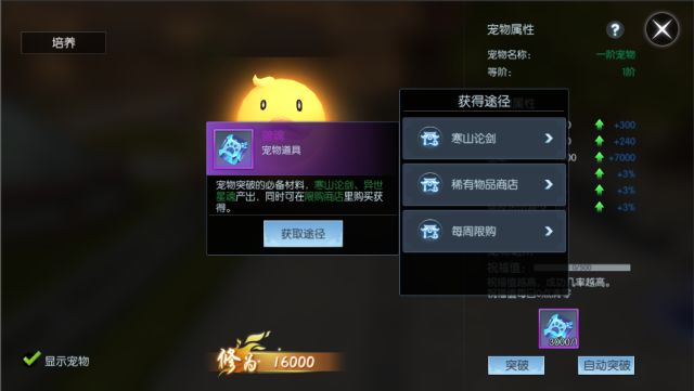 宠物进阶道具 宠物进阶需要的是 道具“兽魂” 。落落越看越像印着熊掌的蓝莓软糖……总之,只要有足够的“兽魂软糖”,道友就能点击 突破 ,让宠物进阶获得 更高的修为和更炫酷的外表 !