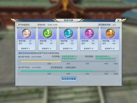 根据采集到的灵气品质不同,可以收获不同数量的 金币 与 家族贡献 ,每天限量三次。