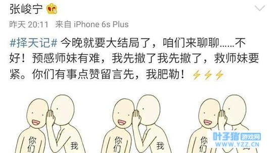 6. 饰演秋山君的张君宁发微博称: #择天记# 今晚就要大结局了,咱们来聊聊……不好!预感师妹有难,我先撤了我先撤了,救师妹要紧。你们有事点赞留言先,我肥勒!