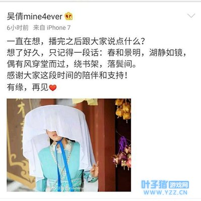 3. 饰演白落衡的吴倩微博称:一直在想,播完之后跟大家说点什么?想了好久,只记得一段话:春和景明,湖静如镜,偶有风穿堂而过,绕书架,落鬓间。感谢大家这段时间的陪伴和支持!有缘,再见