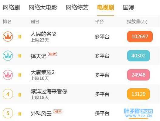自进入四月,中国观众就陷入观剧忙碌状态,因为卫视台各网络视频平台正播着全民观看的正剧《人民的名义》、流量明星的青春玄幻偶像剧《择天记》以及中规中矩的古装历史剧《大唐荣耀2》,并且这三部剧占据着国内网络播放量前三名。