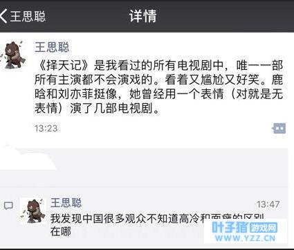 就如娱乐圈纪委王思聪吐槽的:“《择天记》是我看过的所有电视剧中,唯一一部所有主演都不会演戏的。看着又尴尬又好笑。鹿晗和刘亦菲挺像,她曾用一个表情(对就是无表情)演了几部电视剧。”随即又在评论里发“我发现中国很多观众不知道高冷和面瘫的区别。”你可别说,王思聪每次炮轰的可真是非常中肯、到位!