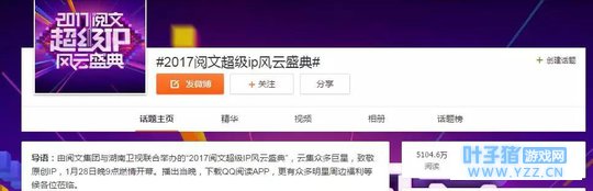 盛典三年, IP变现能力凸显 从2015年至今,中国原创文学风云榜已经走过了三个年头,作为中国最大的网文IP孵化与输出平台,每年的中国原创文学风云榜都备受行业以及众多书迷们的关注,有人将其称之为“IP奥斯卡”,今年更是以超级IP风云盛典为主题,而 #2017阅文超级IP风云盛典#这一微博话题的阅读量高达5000万,讨论度也已经超过了10万, 如今中国原创文学风云榜无疑已经成为了阅文的又一档爆款IP。